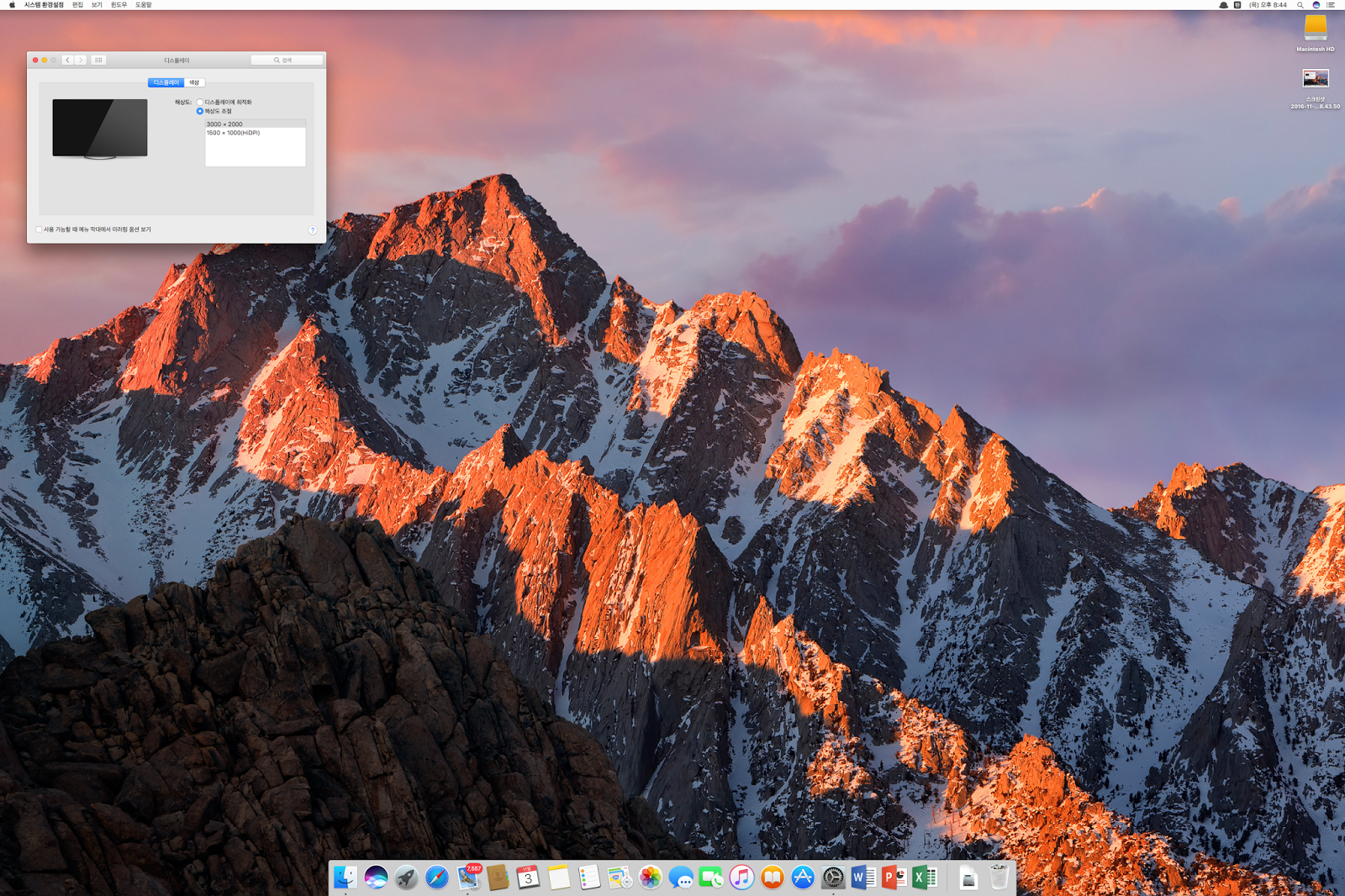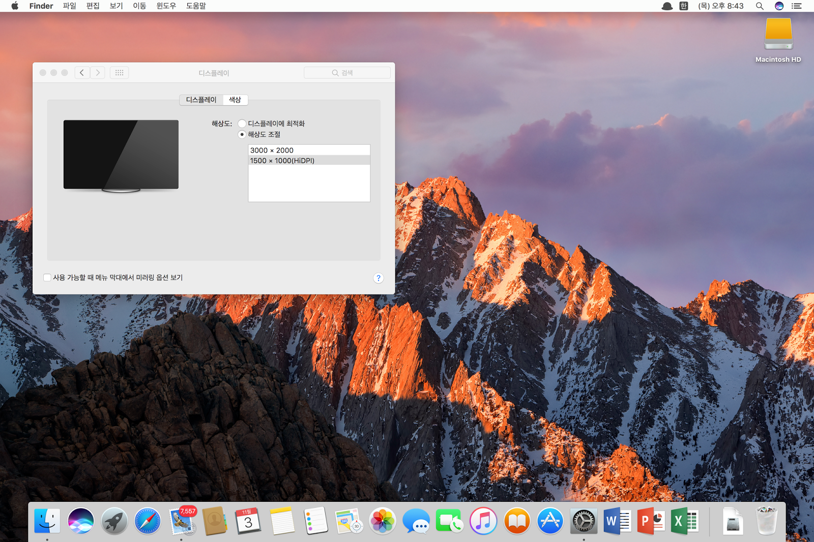 - 이제 '시스템환경설정' > '디스플레이' > '해상도조절' 에가보면 반으로 떨어진 해상도가 보일 것이고 그걸 선택하면 다음과 같이 됨