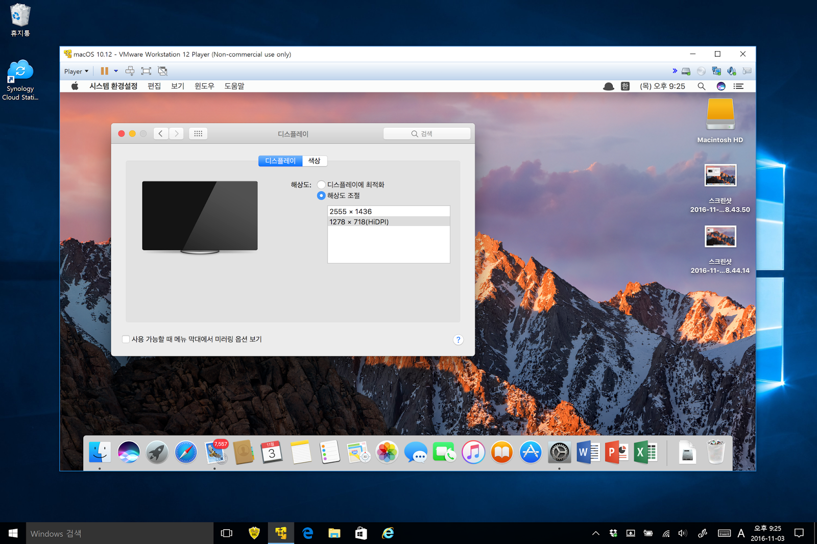 - 윈도우 PC가 Mac의 레티나 급의 해상도를 갖고 있다면.... macOS 가상머신의 글자가 너무 작아서 보기 어려울 것임. 이때는 레티나맥북의 '해상도 조절' 기능이 반드시 필요함