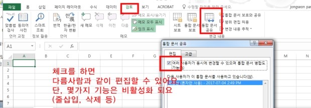 위쪽 메뉴얼에 검토 -> 통합문서공유 -> 편집 -> 여러사용자가 동시에 변경할 수 있으며 통합 문서 병합도 가능에