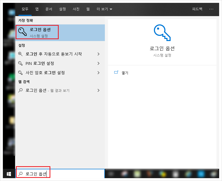 모니터 왼쪽 하단에 있는 윈도우 검색창에 "로그인 옵션"이라고 검색하고 설정 창을 열어주세요. 이때 주의할점은 로그인 옵션을 붙여서 쓰시면 검색이안되기 때문에 꼭 띄어쓰기 해주세요.