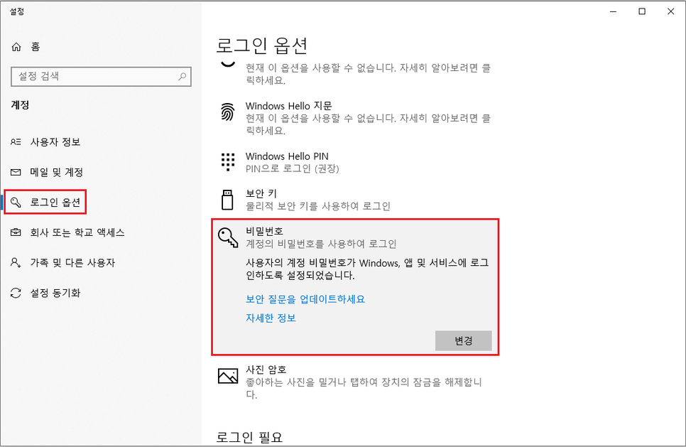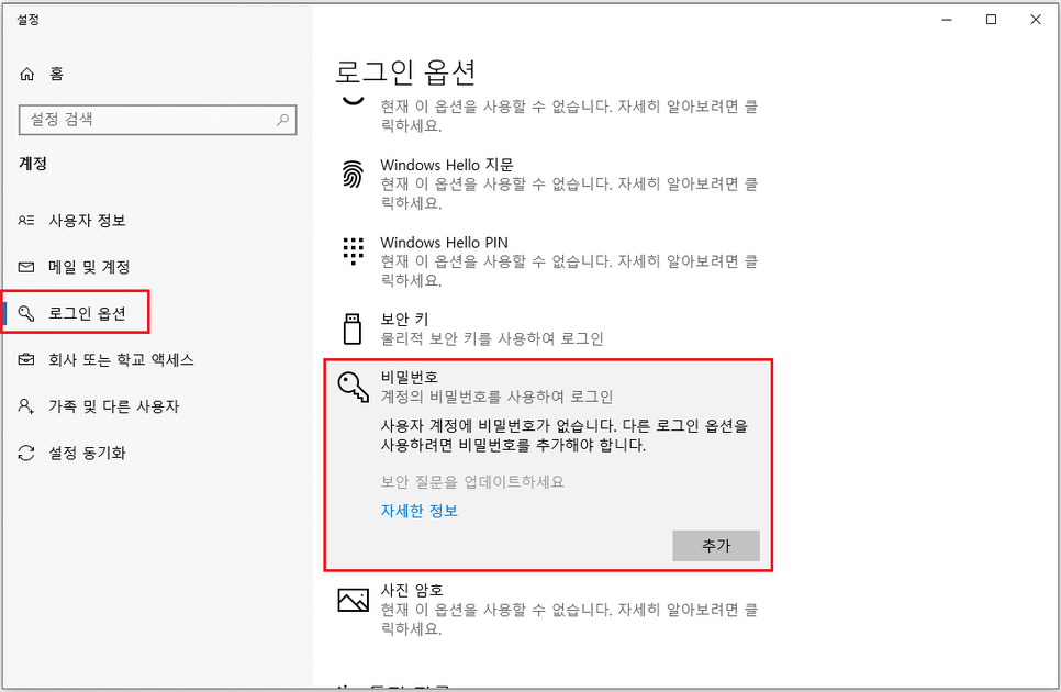 로그인 옵션 설정 창에 들어가면 비밀번호 탭이 있으니 클릭해서 추가를 눌러주시면 됩니다.