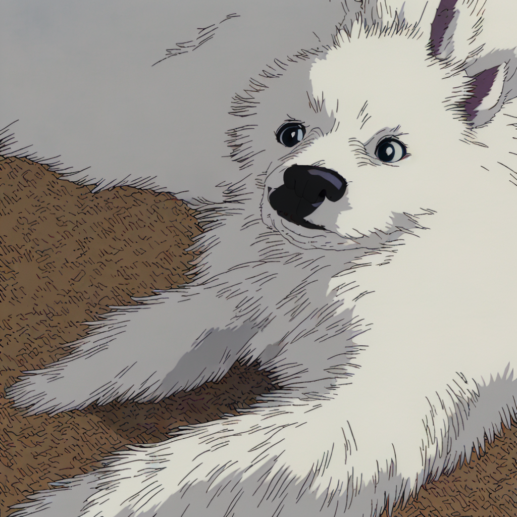 Studio Ghibli style, fluffy white Spitz dog, soft fur, big expressive eyes, small pointed ears, happy and playful, wagging tail, cinematic composition, highly detailed, masterpiece, do not change background, keep original background, only modify dog to Ghibli anime style <lora:ghibli_style_offset:1>Lora 설정은 1